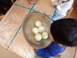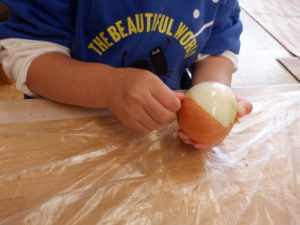 指先を器用に使った、薄い薄い玉ねぎの皮をめくっています!