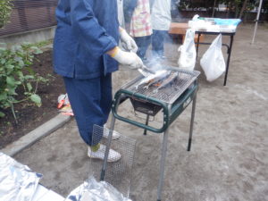 田無ひまわり保育園の園庭で、さんまを炭火で焼く