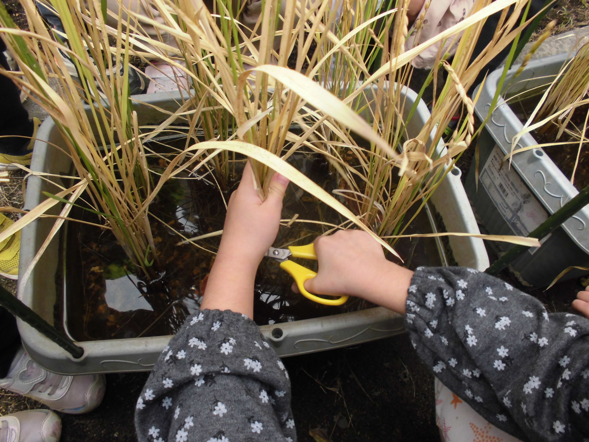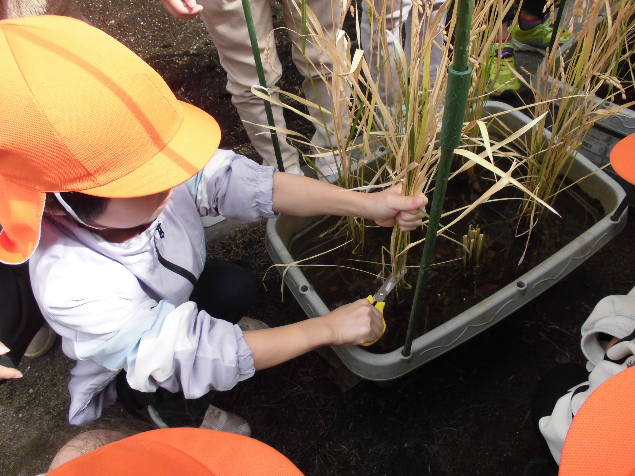 クラスみんなで育てた稲をハサミで根元を切っていきます。